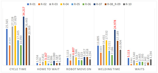 The first column of Table 3 shows the known cycle time and the following columns show each of the sub-cycle times previously defined. As can be seen, the R-07 robot is not the worst one in all the columns, it is only the sub-time of the welding cycle time. Figure 6 shows a graph of the cycle times. Figure 7 shows a comparison graph of the different sub-cycle times.