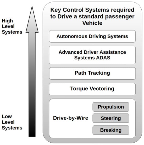 The lowest level of vehicle functional operation considered here is DbW systems. These are broken up into three categories: braking, propulsion (electric drive), and steering. Without these three systems, a car cannot perform its primary function of safely moving from one point to another. In modern-day vehicles, these systems are insufficient to ensure a standard level of safety, efficiency, or ride comfort. However, they are still the starting point for good driving performance. DbW is the term used to describe the translation of a command signal to an actuator in a vehicle electronically instead of mechanically. The central Drive-by-Wire systems that have seen development in this regard are braking, accelerating, steering, and parking/shifting. The first three are the core of X-by-wire technology [26,27].
