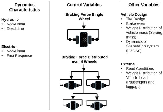 Braking is a process by which kinetic energy is removed from a moving vehicle. It is vital in ensuring vehicle safety, especially when considering how uneven braking or aggressive braking can lead to undesirable responses. These are key in considering control strategies for brake-by-wire systems [28]. There are three main categories of advanced braking control strategies: Regenerative braking, braking force Ddistribution, and Anti-Lock Braking Systems (ABSs) [29]. The goals of each strategy are different, and these technologies are often combined in modern vehicle systems with many configurations and styles of braking systems available. At its fundamental level, a brake involves applying a force at each wheel of a moving vehicle. The dynamic response of the individual brakes will depend on several characteristics, including the type of energy used to generate the braking force, the most common of which are electrical, mechanical, hydraulic and hybrid [30]. A simplified depiction of this is shown in Figure 4. To effectively stop a moving vehicle, a braking operation should provide the correct amount of torque for stopping while maintaining contact with the road surface and reduce slipping. Capturing the dynamics of braking systems benefits from complex or intelligent modeling strategies because they are affected by many factors and are non-linear [31,32]. Additionally, the amount of torque and optimal braking torque profiles differ from situation to situation depending on parameters such as road conditions, brake ware, and tire design [33].