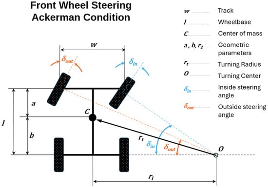 The fundamental principles widely used in estimating individual wheel steering angles are parallel steering configuration and Ackermann steering. In parallel steering, both front wheels turn at the same angle in response to the same input reference steering angle. On the other hand, Ackermann steering ensures that all wheels turn about a coincident point or turning center, which reduces tire wear and is generally a preferred steering model. These apply to the case of four-wheel steering (4WS) and two-wheel steering (2WS), with the latter depicted in Figure 5 with 4WS explanation found in [54].