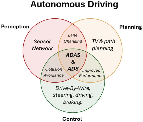 Combining DbW systems and TV presents the next step in a natural progression of automotive control toward full vehicle autonomy. A requirement that must be met for full vehicle autonomy is that path planning in response to a vehicle’s environment is performed without human intervention. Over the last decade, the development of applied deep learning models in real-world environments has enabled the integration of perception into vehicles, which allows this to take place [86,87]. This has opened the door to vehicle automation, with many research examples and applications [88]. Some of the most notable can be found in the development of ADAS systems, such as collision avoidance, lane-changing assistance, ACC and others. In addition, fully autonomous systems combine these to replace a driver altogether [89]. This section discusses the application of these and how integrating AI models with MPC provides convenient avenues for improved control. The application of AI and ML becomes a more relevant tool in higher-level systems as they are more complex and pose a more interesting modeling challenge. The relationship between vehicle technologies and applications is loosely described in the Venn diagram in Figure 7, with more details discussed below.