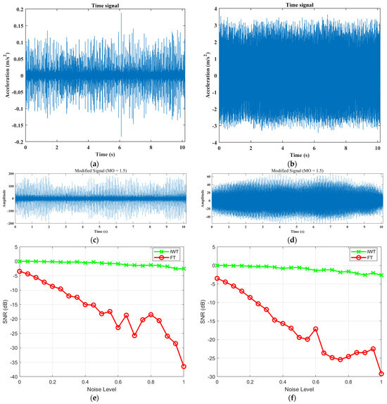 In order to further verify the superiority of IWT over FT, the signal-to-noise ratio (SNR) obtained between the two was compared with the increasing noise intensity. The noise intensity is set to [0, 1] and the step size is 0.05. Two sections of corrected fault signals with strong noise are used for testing, as shown in Figure 2c,d. In the figure, (e) and (f) show a comparison of the signal-to-noise ratio of the two signals processed by FT and IWT, respectively. It can clearly be seen that the signal-to-noise ratio after IWT processing is significantly higher than that of FT and is stable. The above results once again prove the feasibility of the proposed method.