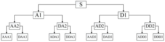 Therefore, this paper performs improved wavelet transform [28] processing on the square envelope of the corrected signal, and uses a tree structure embedding algorithm to decompose and calculate the noisy signal layer by layer, as shown in Figure 3 (where S is the original signal, and A1 and D1 are high-frequency and low-frequency signals, respectively. Subsequently, the decomposed frequency band will be divided into high and low halves to match with the signal spectrum, thereby obtaining a more refined decomposition). The noise signal is decomposed by selecting the appropriate number of layers and wavelet bases, and then selecting the appropriate threshold to quantify each layer system; finally, the denoised signal is obtained by reconstructing the wavelet coefficients.