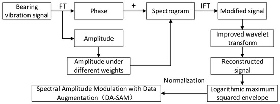 Although the above work has achieved excellent results, the application of SAM in practical projects still faces some challenges. First, while SAM enhances the weight of fault components, noise components with similar amplitudes also increase, which will lead to invalid SAM diagnosis results; second, in a strong interference environment, the interference component may be the dominant component of the signal. Although the signal has been modified, it is still possible to drown fault information in interference. Based on this, a data-enhanced spectral amplitude modulation method (DA-SAM) is proposed. In this research, first, the signal is transferred from the time domain to the frequency domain through Fourier transform to obtain the amplitude and phase, and the amplitude is assigned different weight indices to obtain the modified amplitude; then, the obtained modified amplitude is combined with its original phase to obtain the modified signal, and the improved wavelet transform is used to further reduce noise and reconstruct; finally, its logarithmic maximum square envelope spectrum is generated to complete the DA-SAM diagnosis. The feasibility and superiority of this study compared with some of the classic methods are verified.