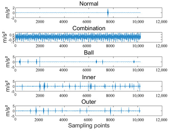 In this paper, the length of the samples in the data set is 102,400, and a load of 30 HZ-2 V is used; fault types as shown in Figure 6.