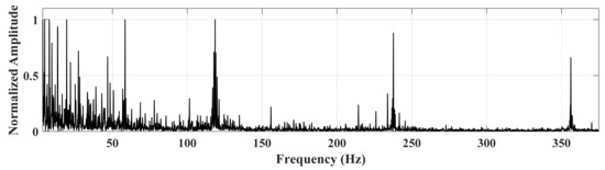 The calculation formula for the fault frequency is as follows, where represents the bearing rotation speed, and is the number of rolling elements: