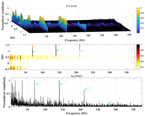 Then, the vibration signal was analyzed using the DA-SAM method proposed in this paper, and the results are shown in Figure 10. The blue arrow represents the frequency and doubling of the outer ring fault signal. To control the variable, the weight index was still set to 1.5. It can be observed that the bearing failure frequency occupies an absolute dominant position in the range of , without any other interference components. , , and can be clearly observed in the two-dimensional graph, and , , , and can be observed in the logarithmic maximum square envelope spectrum. Compared with those in Figure 9, the analysis results are significantly improved.