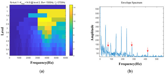 Inner ring fault analysis results based on the fast spectral kurtosis method. (a) Fast kurtosis plot; (b) envelope spectrum.