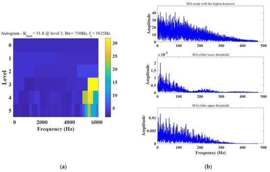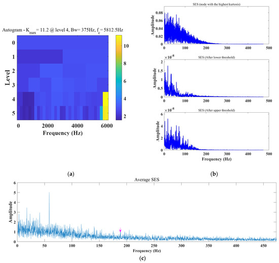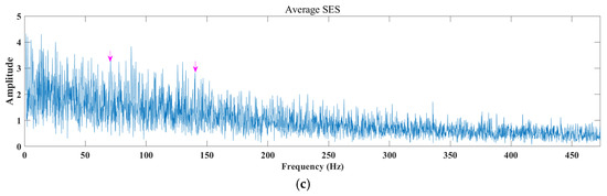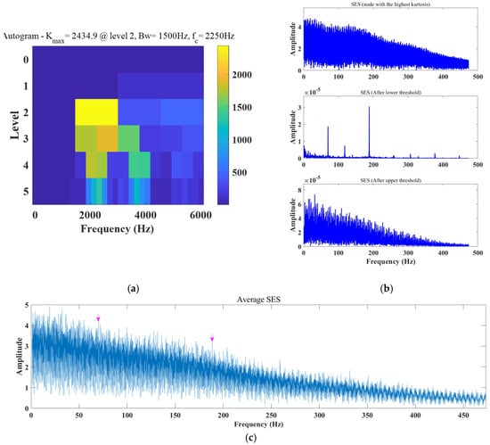 We went on to analyze the experimental signal with the Autogram method and fast spectral kurtosis method. The red arrow and pink arrow represent the fault frequency and doubling. The fast kurtosis diagram method is shown in Figure 23 (where Bw is the bandwidth and fc is the center frequency). The optimal center frequency fc found is 4968.75 Hz. Only an extremely weak fo can be observed in the envelope spectrum, but no fi. The results of the Autogram method are shown in Figure 24. Its square envelope spectrum according to the determined optimal filtering parameters can be seen, which are the results at the maximum kurtosis value and after the threshold increase and decrease operations, respectively, as shown in Figure 24b. The optimal center frequency fc was found to be 2250 Hz, among which only fo and fi were observed in the square envelope spectrum after lowering the threshold, and no frequency doubling was observed in the other two treatments. The average square envelope spectrum also has a large number of irrelevant components and is dominant.