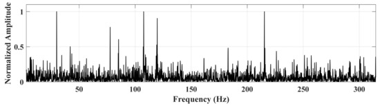 A time domain diagram of the outer ring fault signal and a time domain diagram of the corrected signal are shown in Figure 7. To facilitate the next comparison, the envelope spectrum of the original signal of the outer ring fault is given first, as shown in Figure 8.