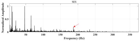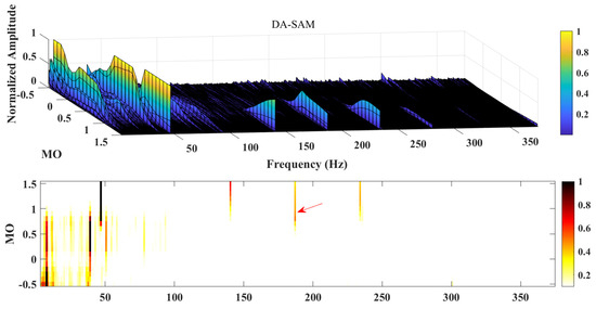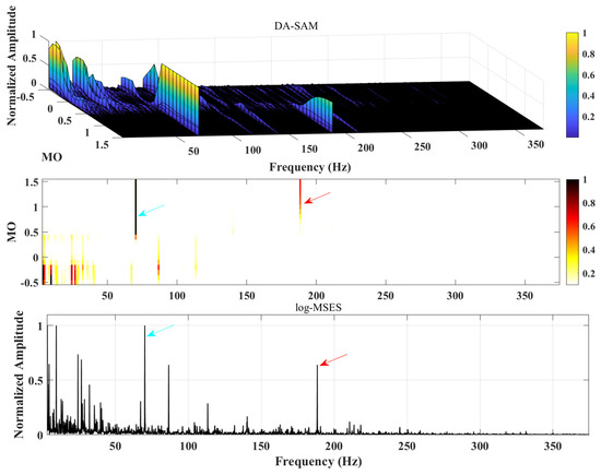 The results of the DA-SAM method proposed in this paper are shown in Figure 16. The red arrow represents the inner ring fault frequency and doubling. The is 1.5. From the two-dimensional graph, it can be observed that although the fault component in the interval is disturbed to a certain extent, the fault frequency can be detected and recognized, and is also observed in the logarithmic maximum square envelope spectrum. Compared with Figure 15, the effect is improved.