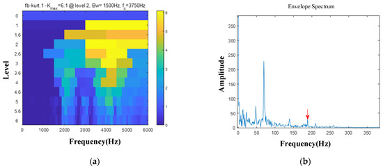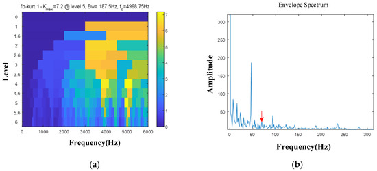 Next, we continue to analyze the experimental signal through the Autogram method and the fast spectral kurtosis method. The red arrow and pink arrow represent the inner ring fault frequency and doubling. The fast kurtosis diagram method is shown in Figure 17 (where Bw is the bandwidth and fc is the center frequency). The optimal center frequency fc found is 3750 Hz. The envelope spectrum can show the fault frequency fi, but it is not in absolute dominance. The results of the Autogram method are shown in Figure 18. Its square envelope spectrum according to the determined optimal filtering parameters can be seen, which shows the results at the maximum kurtosis value and after the threshold increase and decrease operations, respectively, as shown in Figure 18b. The optimal center frequency fc found is 5812.5 Hz, the envelope spectrum and the average envelope spectrum are dominated by noise components, and no faults can be observed.