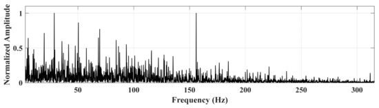 The time domain diagram of the inner ring fault signal and the time domain diagram of the correction signal are shown in Figure 13. The envelope spectrum of the original fault signal in the inner ring is shown in Figure 14.