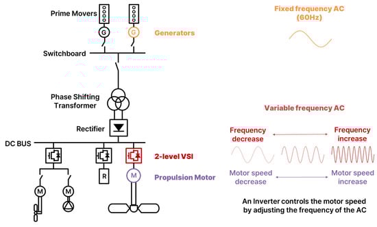 In light of mounting societal pressure for carbon neutrality, the development of ecologically friendly ships has gained momentum within the environmental and energy sectors. The development of fuel cells, hydrogen- and ammonia-powered ships, and electric propulsion ships is underway [7]. Electric propulsion ships, in particular, have emerged as a pivotal technology in the future maritime industry owing to their significant reduction in air pollutants [8,9]. Notably, electric propulsion ships eschew traditional engine facilities, relying instead on inverters to drive the propulsion motor, as shown in Figure 1. The efficiency and performance of the inverter influence the overall system’s efficiency and stability [10,11].