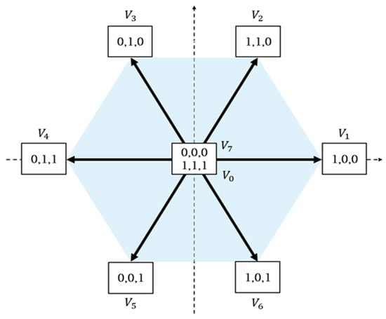 Depending on the combination of switching states for each phase, the two-level inverter has eight different switching states, resulting in six active voltage vectors (V1, V2, V3, V4, V5, and V6) and two zero voltage vectors (V0 and V7). The voltage vector diagram and switching states of the two-level VSI are shown in Figure 3. Because V0 and V7 generate the same zero voltage vector (V0 = V7), only seven distinct voltage vectors exist. In other words, while a three-phase two-level VSI has eight different switching combinations, it can only deliver seven distinct voltage vectors. The switching states and output voltages corresponding to the voltage vectors of the two-level VSI are listed in Table 2.