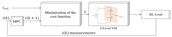 The load current for each switching possibility is predicted using Equation (6). The future value of the load current is determined by evaluating the cost function g for each of the seven possible voltage vectors generated using the two-level VSI, as shown in Table 2. The voltage vector that minimizes the cost function is then selected and applied during the next sampling point.