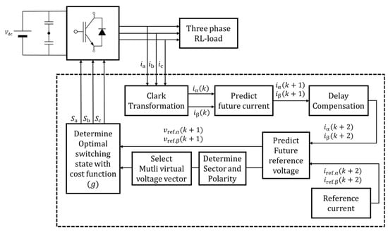 Conventional MPC systems have several inherent disadvantages, such as unfixed switching frequency, large tracking current error, and significant harmonic current. To address these challenges, this study proposes a simplified MPC approach that leverages virtual voltage vectors. This method offers enhanced control performance compared with conventional single vector-based MPC techniques. By employing virtual multi-voltage vectors, the proposed method not only boosts performance but also reduces computational burden through pre-vector selection. The block diagram of the proposed method is shown in Figure 5.