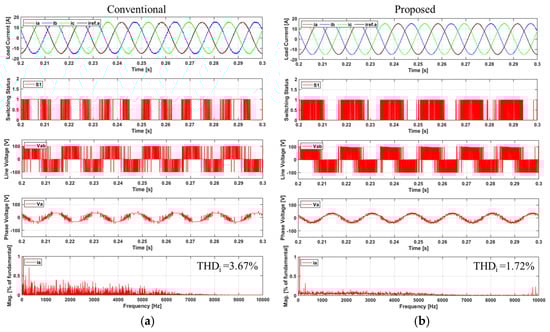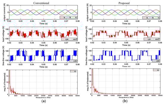Performance analysis was conducted through simulations using an input DC voltage (Vdc = 100 V) and an RL load (R = 1.2 Ω, L = 5.3 mH). The reference current magnitude was set at 15 A, based on a modulation index of 0.7. The values of variables used for the simulation are listed in Table 4.