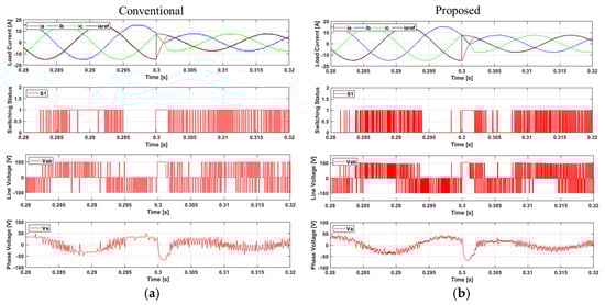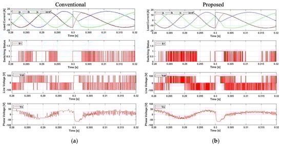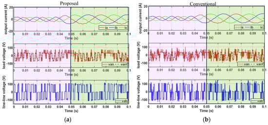 Furthermore, the performance of both methods was evaluated under transient conditions with changing output frequencies. The comparison included three-phase output currents, a-phase reference current, line-to-line voltage, and load phase voltage under these conditions. The proposed method maintained a fast response similar to that of the conventional MPC during transient states, despite considering multi-vectors. Additionally, the proposed method demonstrated superior output current performance under low-frequency conditions. Once again, the consideration of multi-vectors did not impact the computational load (Figure 12).