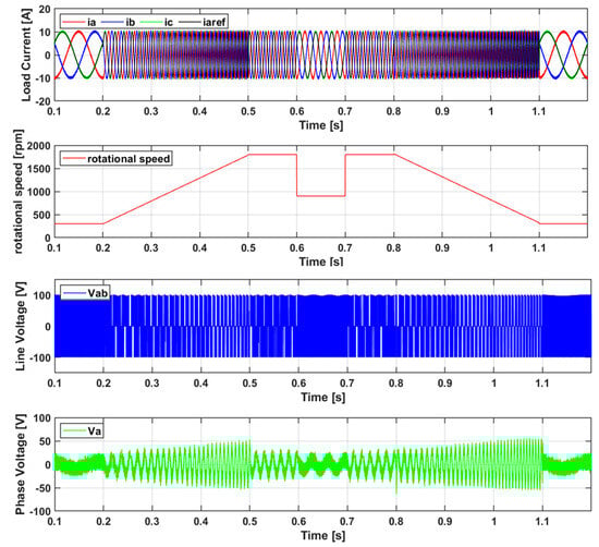 Output performance of the Prop-MPC in load profile operation of an electric propulsion system (3-phase output current, a-phase reference current, load profile (rpm), line-to-line voltage, load phase voltage).