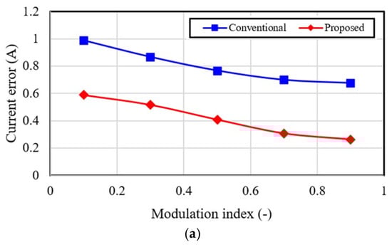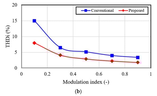 The output performance comparison of both methods under varying modulation index conditions is shown in Figure 15. This comparison allowed for performance evaluation under changing load conditions. The proposed method outperformed the conventional method in terms of current error performance and output THD across all modulation index conditions. This enhancement in output current performance can be attributed to the consideration of multi-vectors in the proposed method.