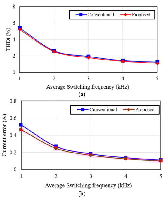 With N set to 10,000, the error represents the average of these 10,000 calculated values. The proposed method, which considered multi-vectors, demonstrated lower current errors across all sampling frequency ranges compared with the conventional MPC. Additionally, a comparison of the output current THD of both methods is shown in Figure 14b. The output current THD can be calculated as follows: