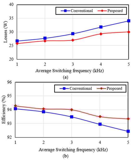 Performance comparison of Conv-MPC and Prop-MPC based on changes in average switching frequency. (a) Total losses. (b) Efficiency.