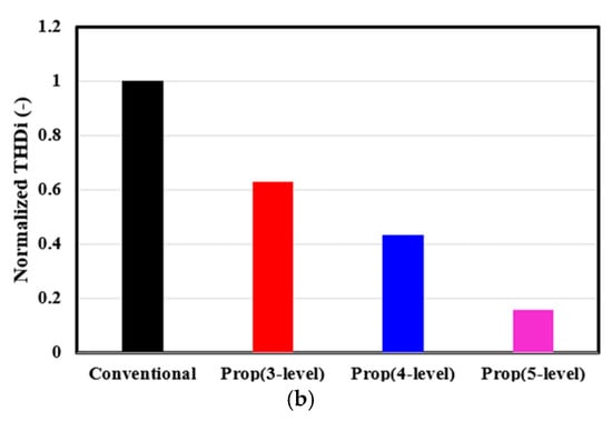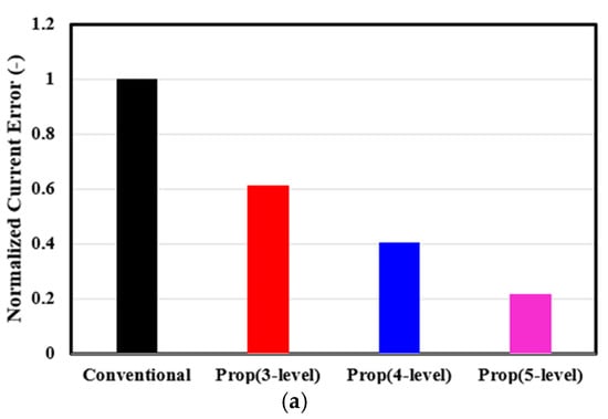 Figure 18 illustrates the changes in current error and current total harmonic distortion (THDi) as the number of virtual voltage vectors increases in the proposed method. As the proposed method’s virtual vectors increase from 3-level to 5-level voltage, there is a significant reduction in both current error (approximately 80%) and THDi (approximately 85%) compared to the conventional method. This indicates that increasing the number of virtual vectors allows for a more precise fulfillment of the load’s requirements.