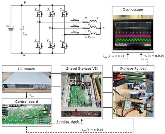 The implementation of the proposed method utilizing multi-vectors with pre-selection was performed with a prototype setup, as shown in Figure 19. The experimental setup comprised a three-phase VSI with IGBT modules and an RL load. A digital signal processor (DSP, TMS320F28335) was employed to execute the switching algorithm for the VSI.