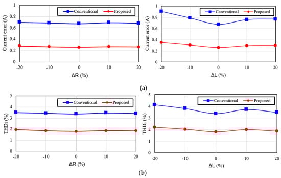 Model parameter uncertainty is a critical factor in model predictive control (MPC) systems, particularly when applied to load models. The impact of load resistance and inductance uncertainties on both the proposed and conventional methods is shown in Figure 22. The comparison of load current performance reveals that uncertainty in load resistance has a minimal effect on the performance of both methods. However, when the load inductance is underestimated, it results in larger current errors and total harmonic distortion (THD) compared to overestimation. This analysis emphasizes the importance of the accurate modeling of inductive components, such as inductance, in maintaining the accuracy and stability of the control system. This underscores that mismatches in inductance values can adversely affect current regulation and overall system performance.