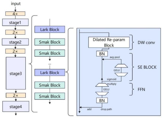 Figure 2. This method allows the network to cover a wider input region in a single convolution operation, thus capturing more global information. The extraction of this global information enhances the network’s ability to understand the overall features of the image, rather than being limited to local features. Moreover, large kernel convolutions can reduce the number of convolutional layers required, simplifying the network structure while improving the efficiency of feature extraction and the model’s representation capacity.