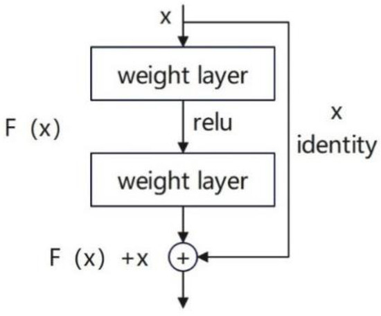 Figure 3. Each residual block includes a skip connection that directly adds the input to the output of the block. This structure allows the network to optimize the residual between the input and the target during training, i.e., the difference between the input and the target, rather than directly learning the target function, as expressed in Equation (5). This approach alleviates the vanishing gradient problem, enabling the gradients to propagate more effectively to deeper layers of the network during back-propagation. Additionally, skip connections help mitigate network degradation, allowing for deeper network stacking without a significant increase in training error. As a result, ResNet improves the model’s representation capacity and training efficiency. Through this innovative network structure, ResNet demonstrates significant performance improvements in handling complex visual tasks.