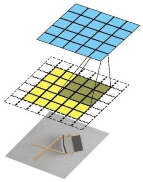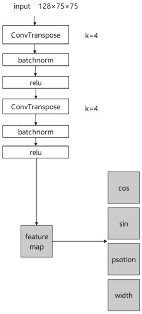 where W represents the width of the input feature map, H represents the height of the input feature map, K denotes the width and height of the convolutional kernel, P indicates the number of zeros to be padded to the feature map, S represents the stride, width_out is the width of the output feature map after convolution, and height_out is the height of the output feature map after convolution. After feature extraction from the 75 × 75 image, up-sampling is performed to restore the image size back to 300 × 300 using transposed convolution, with the calculation process outlined in Equation (7).