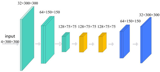 Figure 4. The computations involved can be described as follows: for an input image of size 300 × 300 with n channels, the image is initially convolved with a 3 × 3 kernel, maintaining the dimensions at 300 × 300, and increasing the channel count to 32. Subsequently, the image is processed with a 4 × 4 kernel, reducing its size to 150 × 150 while the number of channels increases to 64. After another convolution with a 4 × 4 kernel, the dimensions decrease to 75 × 75, resulting in 128 channels. In the encoder section, we utilize a multi-layer Convolutional Neural Network (CNN) to extract features from the input image, as illustrated in