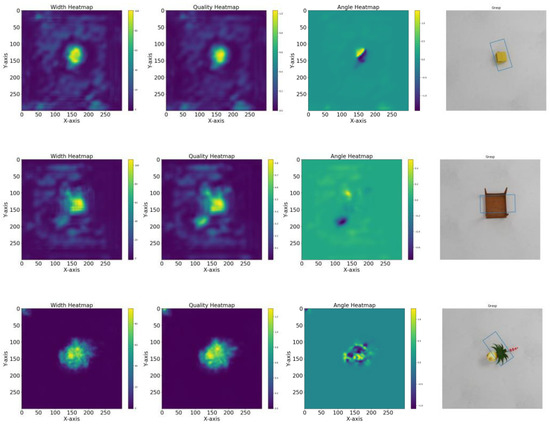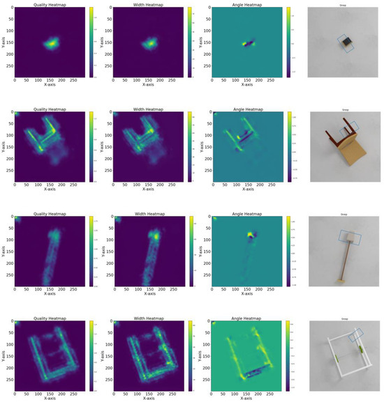 Selecting an appropriate dataset is critical in the training of deep learning models. The quality, size, and diversity of the dataset directly influence the model’s training effectiveness, generalization capability, and performance in practical applications. Poor dataset selection may lead to overfitting, poor generalization, or even an inability to meet the specific requirements of the task. Hence, we opted for the Jacquard dataset to train and evaluate the model. The Jacquard dataset is a publicly available dataset designed specifically for robotic grasping tasks, comprising over 54,000 RGB-D images and grasp annotations, covering a wide range of objects and grasping poses. Covering a wide range of categories from regular shapes (e.g., boxes, spherical objects) to irregular shapes (e.g., curved surfaces, curved and complex geometries), this diversity enables the model to learn the grasping characteristics of different object shapes, which is suitable for generalization in unstructured environments, the grasping of regular objects can help robots deal with stacked objects that are common in industrial manufacturing scenarios, and the grasping of irregular objects improves the adaptability of robots to heterogeneous objects in changing environments. The labels of the dataset are generated by 3D models, providing a large number of accurate grasping poses, and the grasping points of each object are labeled by a set of grasping attitude parameters (including grasping angle, grasping depth, etc.), and these label data meet the gripping requirements of the end effector of the robot. Through accurate annotation, it is ensured that more accurate grasping points are learned during training, and deviations caused by inconsistent manual annotation are avoided. This dataset, generated through simulation, supports the training and evaluation of models in complex environments for grasp detection tasks.