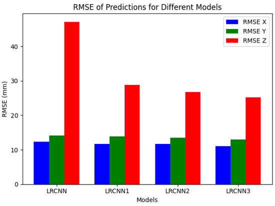 In this study, we quantitatively evaluated the performance of each model by root mean square error (RMSE). Specifically, LRCNN’s RMSE is considered the best benchmark value, with RMSEs of 12.301 mm, 14.132 mm, and 47.144 mm in the X, Y, and Z directions, respectively. In comparison, the RMSE values of the other models are 11.709 mm, 13.826 mm, and 28.822 mm for LRCNN1, 11.634 mm, 13.484 mm, and 26.724 mm for LRCNN2, and 11.066 mm, 12.908 mm, and 25.233 mm for LRCNN3. These results show that, although the performance of other models is close to LRCNN in some dimensions, overall LRCNN still shows lower RMSE, indicating that it has a clear advantage in accuracy and stability in grasping tasks.