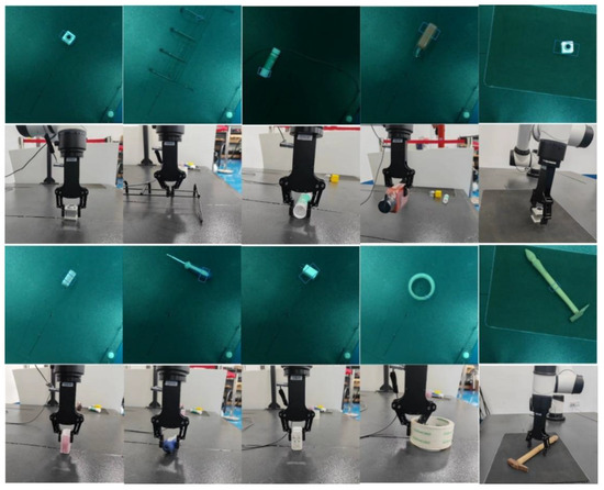 In this section, to thoroughly evaluate the model’s performance in real-world environments, we demonstrate that the model also performs exceptionally well in robotic grasping tasks involving actual objects. The model is not only capable of generating the most robust grasp points for single-target scenarios, but also can produce multiple grasp points for cluttered, multi-target scenarios. To validate the model’s grasping performance in real-world settings, this experiment selected 18 objects of varying shapes, sizes, and materials, covering typical household items and adversarial objects, These objects have different geometric characteristics, including regular shapes (such as cubes) and irregular shapes (tools, furniture), etc., for application scenarios in the industrial environment, including hammers, wrenches, screwdrivers, pliers, etc., which can simulate the combination of objects in the unstructured situation in the real environment to a certain extent; at the same time, considering the clamping force of the end effector, the size and weight of the selected object are within the working range of the electric gripper, as shown in