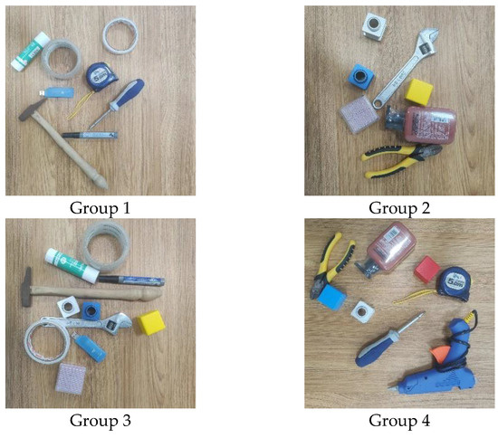 In this section, to simulate cluttered multi-target scenarios, 7 to 10 different household items were randomly placed in the work area and randomly divided into four groups according to item numbers, with each group undergoing five rounds of grasping experiments. The group classifications are shown in