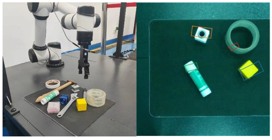 The real-world experiments were conducted using an AUBO 6-DOF collaborative robot. A two-finger parallel electric gripper was used to grasp the objects. The Intel RealSense Depth Camera D435 was employed to capture real-world images, equipped with a pair of stereo lenses for depth data and a monocular RGB lens for color images. The camera was mounted externally on the robot, positioned vertically downward, capturing RGB-D images with a resolution of 640 × 480 pixels.