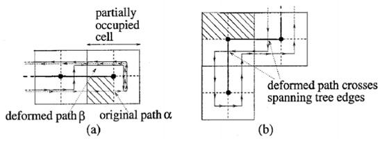 The approach to manage (i.e., avoid) special obstacles consisting of (a) partially occupied cell; (b) deformed path crosses spanning tree edges.
