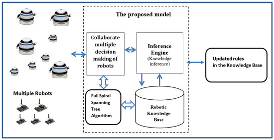 The proposed model consists of seven steps as follows: Step 1, identify multiple objectives for collaborative multiple decision-making in support multiple robots; Steps 2–3, consider an objective function as updated decision variables by dealing with multiple decision-making of Robots; Step 4, consider constraints in multiple decision-making for aggregation of multiple robots’ tasks; Step 5, a primary objective of the FSST algorithm is to ensure that each robot constructs a distinct spanning tree during the navigation of the DOE; Step 6, consider rule and update its weight to the Robotic Knowledge Base (KB); Step 7, find the appropriate rules considered by experts and applied these rules’ weights in the KB. In the processing steps, multiple robot operations can result in reductions in the time taken to cover the DOE given the parallel robot processing implemented in the FSST algorithm. In robot simulations in the experiments, the robot applies existing rules with good behaviors in the Inference Engine for coverage path planning.