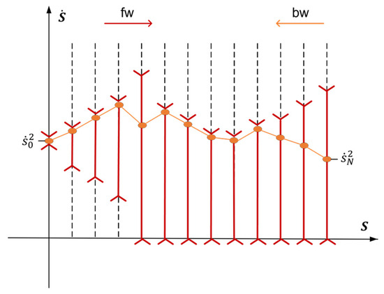 Equations (14) and (15) describe a discrete-time linear system constrained by linear control-state inequality conditions. Based on this system, the optimal parameterization is computed in two passes, as depicted in Figure 3. In the first pass, starting from the initial pseudo-velocity state along the predetermined path, the boundaries of the reachable set are calculated stage by stage using a forward (fw) recursive method. The calculation process is as follows: