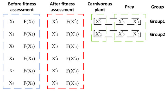 Entering the classification and grouping stage, the algorithm sorts each individual in descending order according to the fitness value, and then it labels the top individuals as carnivorous plants and the remaining individuals as prey. The most suitable prey is assigned to the top carnivorous plant. Immediately afterward, the second and third most suitable prey are paired with the corresponding carnivorous plants. This process repeats until each carnivorous plant is paired with its corresponding prey. After that, the extra prey is paired again starting with the highest-ranking carnivorous plant, and the pattern continues. Take Figure 5 as an example: it shows the visualization of carnivorous plants and prey, in which the population size n is set to 6 and the coefficient k is 2.