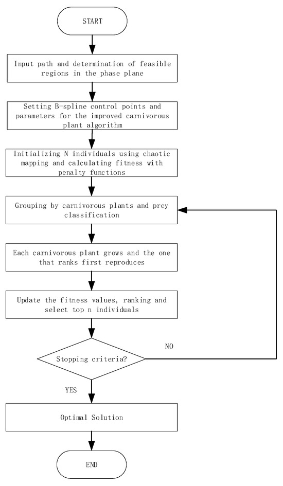 The rest of this paper is organized as follows. The constraints in trajectory planning and the parameterization of the smooth and time-optimal path are discussed in the upcoming section. Then, the reconstruction of feasible regions and the mathematical model for applying cubic B-spline interpolation in the phase plane are presented in Section 3. In Section 4, the Carnivorous Plant Algorithm and its enhancements are introduced. Section 5 provides an analysis of the numerical simulation results. Finally, Section 6 summarizes the key findings and conclusions of this study.