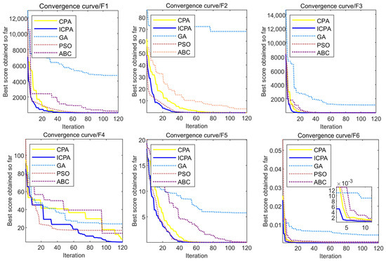 The corresponding test results are presented in Table 2. The optimal iterative convergence curve of each test function is illustrated in Figure 7. It can be observed that ICPA outperforms its comparison algorithm across all test functions.