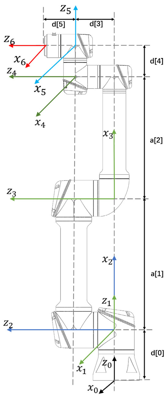 A trajectory optimization simulation experiment was conducted on the UR5 collaborative robot along a predetermined path. Figure 8 shows the UR5 collaborative robot used in the simulation experiment. The DH parameters are used to calculate the kinematics and dynamics of the UR5 robot, with its coordinate system and associated parameters illustrated in Figure 9 and Table 3.