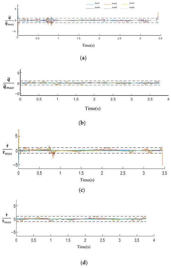 For further analysis, Figure 10 and Figure 11 present the normalized trajectory results for each joint. The constant-step fifth-order Dormand–Prince method, an explicit Runge–Kutta ODE solver, is applied to process the time-parameterized curve. To ensure accuracy, an integration step size of 0.008 s was used during the processing.