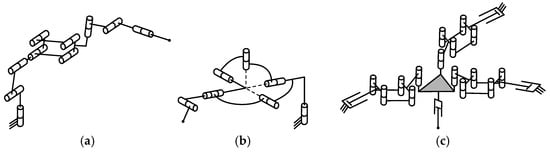 This review focuses on parallel–serial manipulators of the second type. In these systems, a parallel part is not necessarily a multi-DOF parallel mechanism—it can be represented by a simple closed-loop mechanism with one [27] or two [28] DOFs (Figure 2a,b). A serial part can also be a 1-DOF one-joint mechanism [29] (Figure 2c). The reasons that we consider this type of parallel–serial manipulators among the others and perform this review are the following: