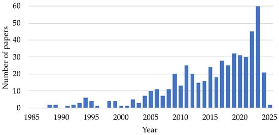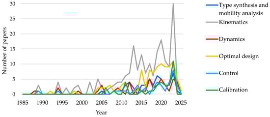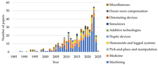 Figure 3 shows the distribution of selected papers by year, starting from 1988 and ending in 2025. We see the number of studies in the last decade is more than in all the previous years, and it continues to increase each year. The decrease in the paper number in 2024 is probably because not all papers published this year have been indexed in Scopus and Google Scholar at the moment of writing this review. Nonetheless, these results verify the growing interest in parallel–serial manipulators.
