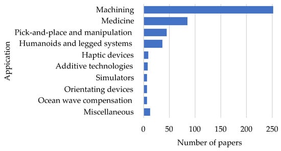 Figure 4 illustrates the distribution of selected papers by manipulator application, ignoring works where the application is not specified. Machining dominates all the other applications put together. In the next section, we explore these applications in more detail and consider the architectures of proposed parallel–serial manipulators.